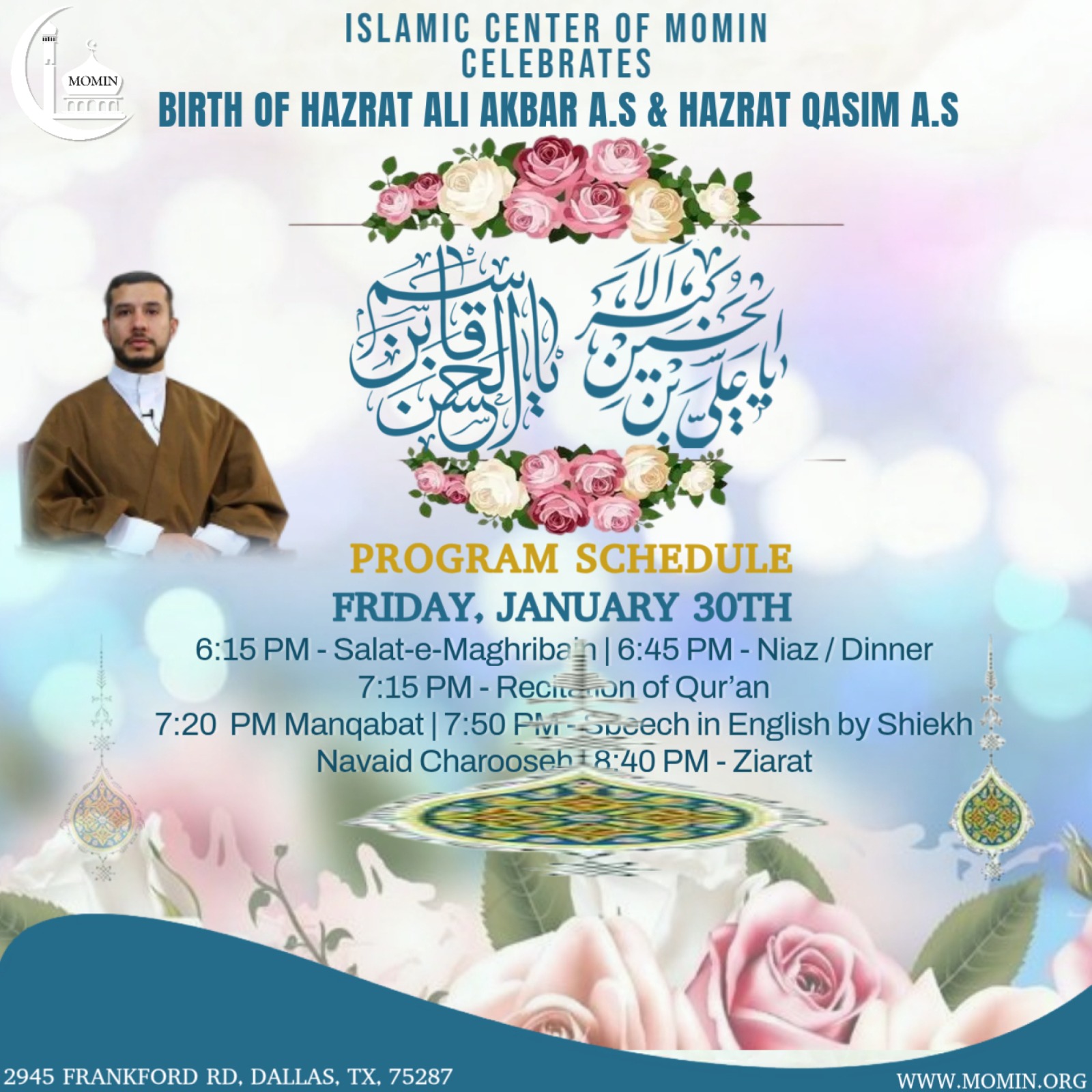 _*Islamic Center of MOMIN Celebrates Birth Anniversary of Youth of Karbala ( Hazrat Qasim A.S & Hazrat Ali Akbar A.S) Friday, January 30th *Program Schedule:* 6:15 PM – Salat-e-Maghrebain 6:45 PM – Niaz / Dinner 7:15 PM – Recitation of Holy Qur’an 7:20 PM – Manqabat Recitation 7:50 PM – English Speech by Sheikh Navid Charooseh 8:40 PM – Ziarat