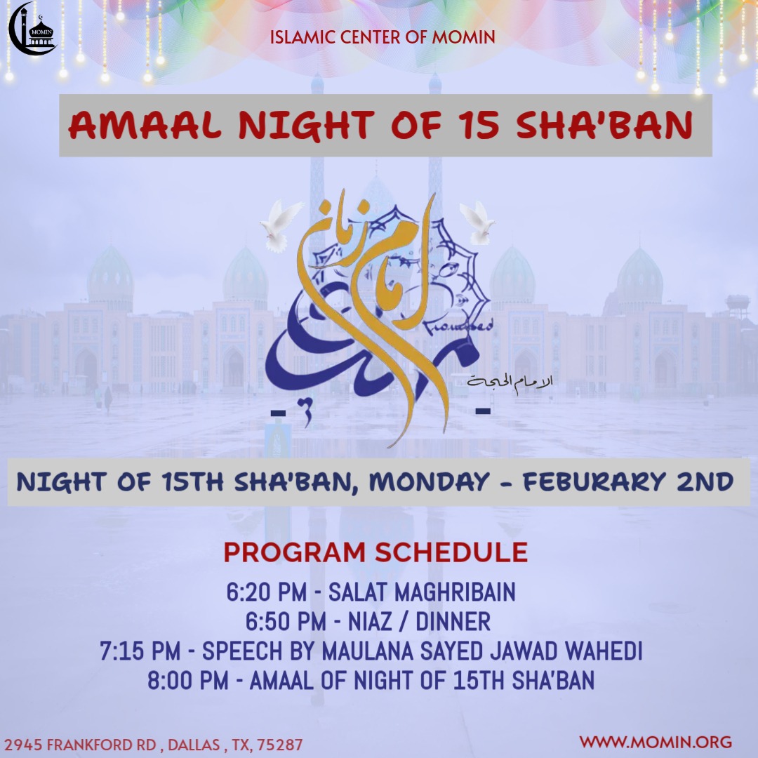 Islamic Center of MOMIN presents – Amaal night of 15th Sha’ban – Monday, February 2nd *Program Schedule:* *Monday (14th Sha’ban)* 6:20 PM – Salat-e-Maghrebain 6:50 PM – Niaz / Dinner 7:15 PM – Speech by Maulana Sayed Jawad Wahedi 8:00 PM – Amaal of night of 15th Sha’ban