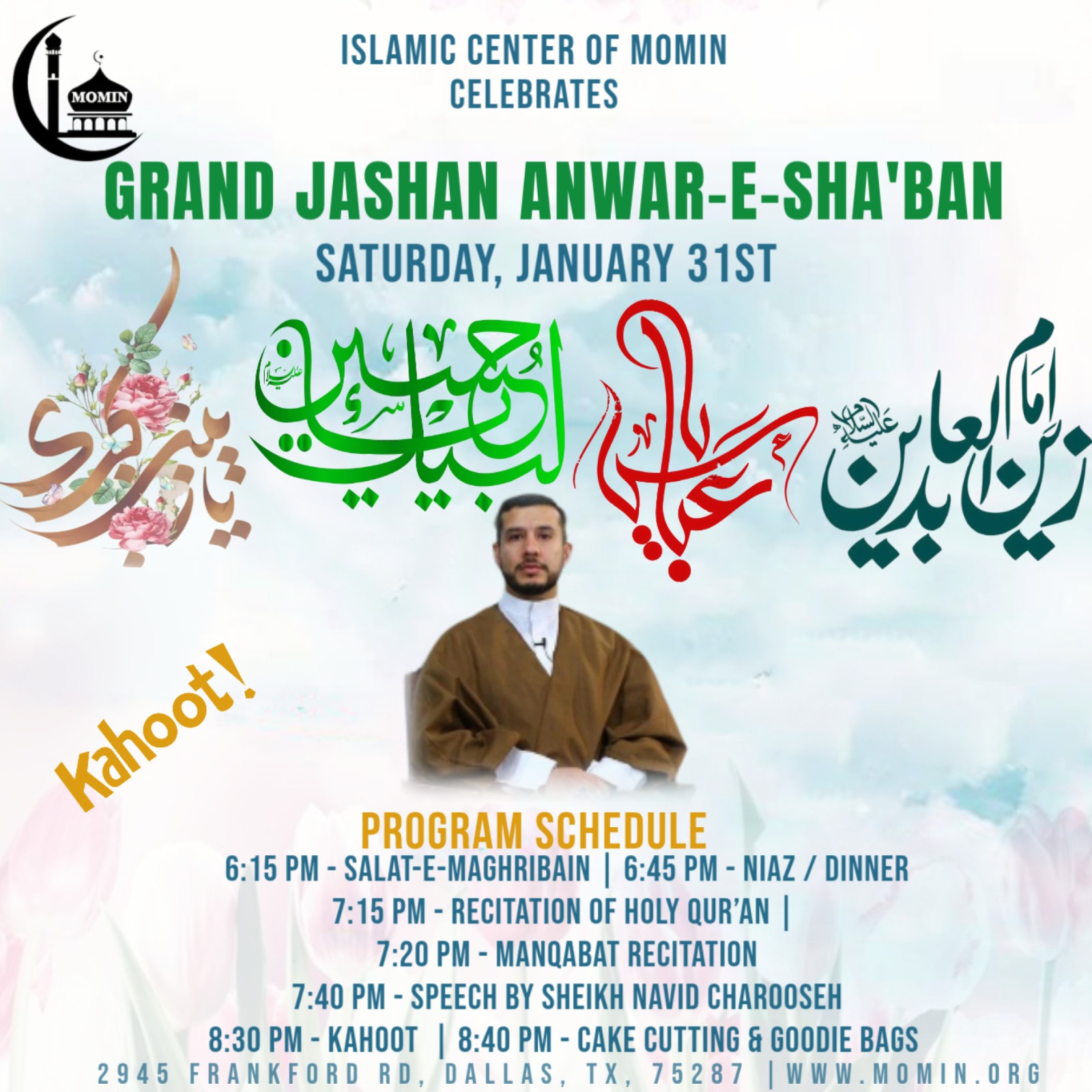 Islamic Center of MOMIN Celebrates Grand Birth Anniversary of Imam Hussain Ibn-e-Ali (A.S), Lady Sayyida Zaynab (S.A) & Hazrat Abbas (A.S) & Imam Sajjad (A.S) on Saturday, January 31s *Program Schedule:* 6:15 PM – Salat-e-Maghribain 6:45 PM – Niaz / Dinner 7:15 PM – Recitation of Holy Qur’an 7:20 PM – Manqabat Recitation 7:40 PM – Speech By Maulana Shiekh Navaid Charooseh 8:30 PM – Kahoot 8:40 PM – Cake Cutting & Goodie Bags